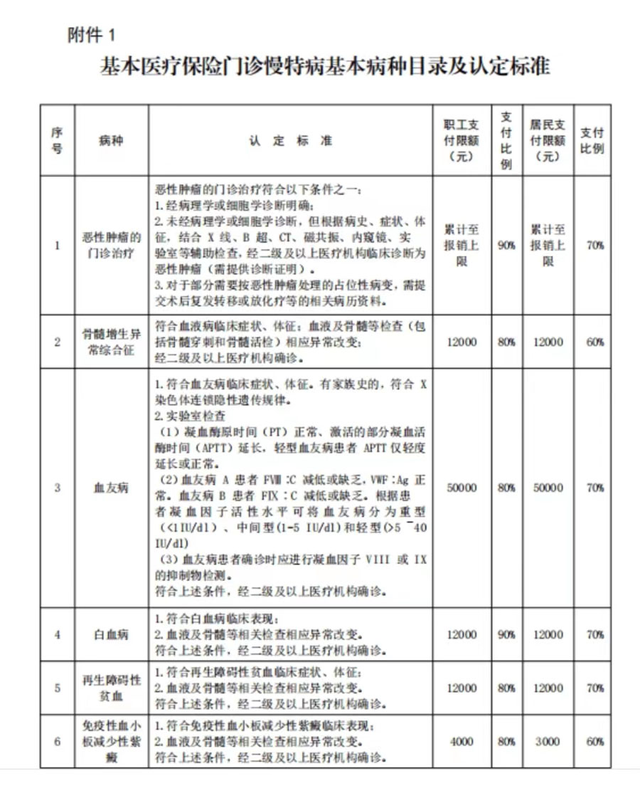 或器官移植(抗排異治療)、尿毒癥透析治療等病種支付比例為 90%,其余病種支付比例為 80%;參保居民惡性腫瘤的門診治療、白血病、組織或器官移植(抗排異治療)、血友病等病種支付比例為70%,其余病種支付比例為 60%。